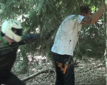 The furious biker creeps up on Andy from behind wielding a large branch. Andy gets dragged to a tree and finds himself taped and bound in a vulnerable position awaiting his fate!