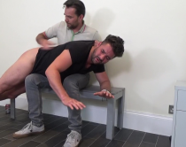 Back over Spencer's knee with his jeans around his ankles, Sebastian now has to endure the humiliation of his mate spanking him on the seat of his lime-green pants, while revealing that Mr Stevens is due to arrive in the next 10 minutes. Spencer wants to make sure that his workshy colleague is seen to be grafting when the boss gets there, and he clearly reckons that the best way to motivate him is with a sore red bottom!