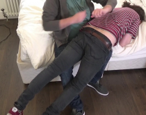 The infuriated landlord delivers 100 hard smacks to the seat of his hapless tenant's trousers with his hand and belt. But then he stands the lad up and takes down his trousers; the next 100 are going to be administered across his tight blue underpants!