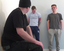 Soon enough it is Sam's turn to be put over the knee, and he too feels Mr X's firm hand across the seat of his tracksuit bottoms. Back on his feet again afterwards, he is still trying to laugh it off.... until Mr X draws his attention to the leather paddle that is hanging on the wall, and tells him that he will soon be feeling that across his bare bottom....