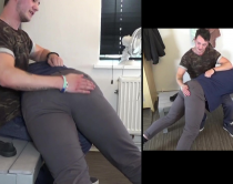 When Marcus says he is going to give John exactly what Andy gave him, John's response is that he will do the same... and a challenge is set in motion: who will spank harder? John sets the stopwatch on his phone, and bends over Marcus's knee for three minutes of solid hand-spanking on the seat of his trousers.