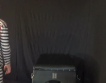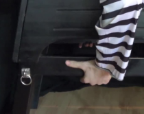 The masked guard, secures him onto the punishment bench fastening the thick, heavy straps which hold the prisoner in place.